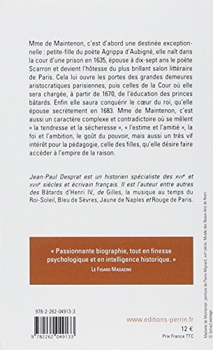 Madame de Maintenon que votre liste de lecture ou vous serez regretter parce que vous ne l'avez pas lu encore dans votre vie.Rang parmi les ventes Amazon: #163110 dans LivresPublié le: 2015-02-12Sorti le: 2015-02-12Langue d'origine: FrançaisDimensions: 7.01" h x 1.18" l x 4.33" L, Reliure: Poche640 pagesPrésentation de l'éditeurL"aimée" du roi.Après le succès du livre de Françoise Chandernagor, la "vraie' biographie de Mme de Maintenon. Mme de Maintenon, c'est d'abord une destinée exceptionnelle : cette petite-fille du poète Agrippa d'Aubigné naît dans la cour d'une prison, épouse à 17 ans le poète Scarron et devient l'hôtesse du plus brillant salon littéraire de Paris. Cela lui ouvre - une fois devenue veuve en 1669 -, les portes de Versailles, où elle sera chargée de l'éducation des princes bâtards ; puis l'attention du roi, et enfin son coeur puisqu'elle l'épouse secrètement en 1683. Mme de Maintenon, c'est aussi un caractère complexe et contradictoire où se mêlent l'ambition, l'autorité, la dévotion, le goût du pouvoir et de l'éducation, la "tendresse et la sécheresse" qu'analyse en elle Fénelon. Mme de Maintenon, c'est encore une femme engagée dans le mouvement des Précieuses. Le combat qu'elle mène notamment dans l'oeuvre de Saint-Cyr offre aux jeunes filles de cette institution un accès à l'empire de la raison si longtemps refusé par les hommes. Femme sans appui, elle sait que le prix à payer est celui d'une réputation intacte et pratiquement d'un renoncement à l'amour. Or, Mme de Maintenon "... ne met point de bornes à ses désirs". Elle veut tout à la fois : la gloire, le salut chrétien et l'amour. D'où des échecs cinglants qu'elle ne masque qu'en reconstruisant pour les générations futures son personnage. "Je suis née franche, il m'a fallu dissimuler..." Pour la postérité, "... elle s'est peinte de dos". Ce livre est écrit "en face d'elle". Quatrième de couvertureFrançoise Chandermagor avait écrit le roman, il y a plus de vingt ans ; Jean-Paul Desprat livre la biographie. Madame de Maintenon, c’est d’abord une destinée exceptionnelle. Mais c’est surtout une femme, une femme dans un siècle rude à celles de son sexe. Dès l’âge de vingt ans, elle est au cœur du mouvement initié par certaines femmes d’élite - les Précieuses - qui désirent s’échapper de la sphère du sentiment où les hommes les cantonnent exclusivement pour accéder à l’emprise de la raison qui leur a toujours été refusé. Dans son cas, celui d’une femme sans appui, elle sait que le prix à payer pour cela est celui d’une réputation intacte et pratiquement d’un renoncement à l’amour. Or Madame de Maintenon « …ne met point de bornes à ses désirs ». Elle veut tout à la fois et simultanément la bonne gloire de la réputation et l’amour….Biographie de l'auteurJean-Paul Desprat a déjà publié: Les Batards d'Henri IV (Perrin); Henri IV ou Le règne de la tolérance (Gallimard); Le Cardinal de Bernis (Perrin); Madame de Maintenon (Perrin); Gilles. La Musique au temps du Roi-Soleil (Gallimard); Bleu de Sèvres (Seuil); Mirabeau (Perrin). Vous trouverez ci-dessous les commentaires du lecteur après avoir lu Madame de Maintenon. Vous pouvez considérer pour votre référence.